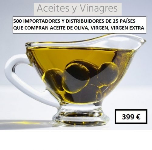 Este listado internacional de compradores y clientes, está formado por empresas importadoras y distribuidoras, que están especializadas en distribuir aceites, vinagres, aceitunas y encurtidos.