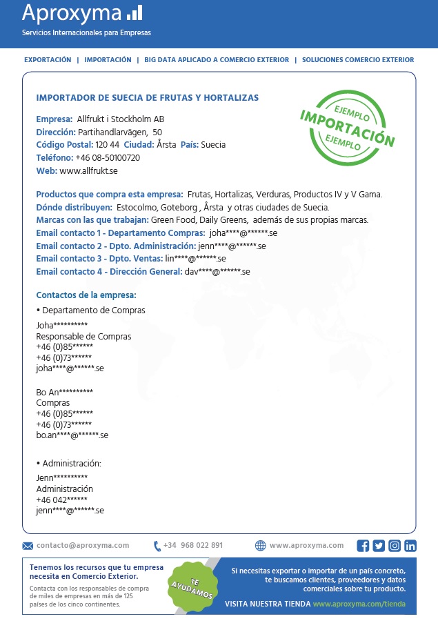 - Emails de contacto: Email general , email del departamento de compras y email de otros departamento de la empresa encargado de gestionar compras, ventas, importación…etc