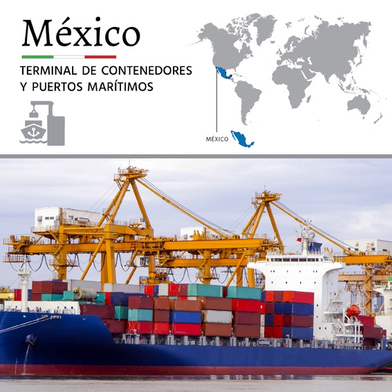 - Infografía y dibujo de todo el mapa de México con detalle de todos las terminales de contenedores y puertos marítimos